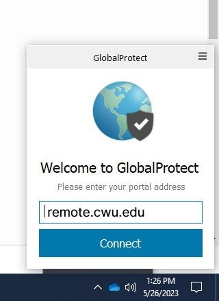Connect to the VPN (Gateway/Portal address is remote.cwu.edu). Login using your MyCWU credentials.See the instructions above for these images.