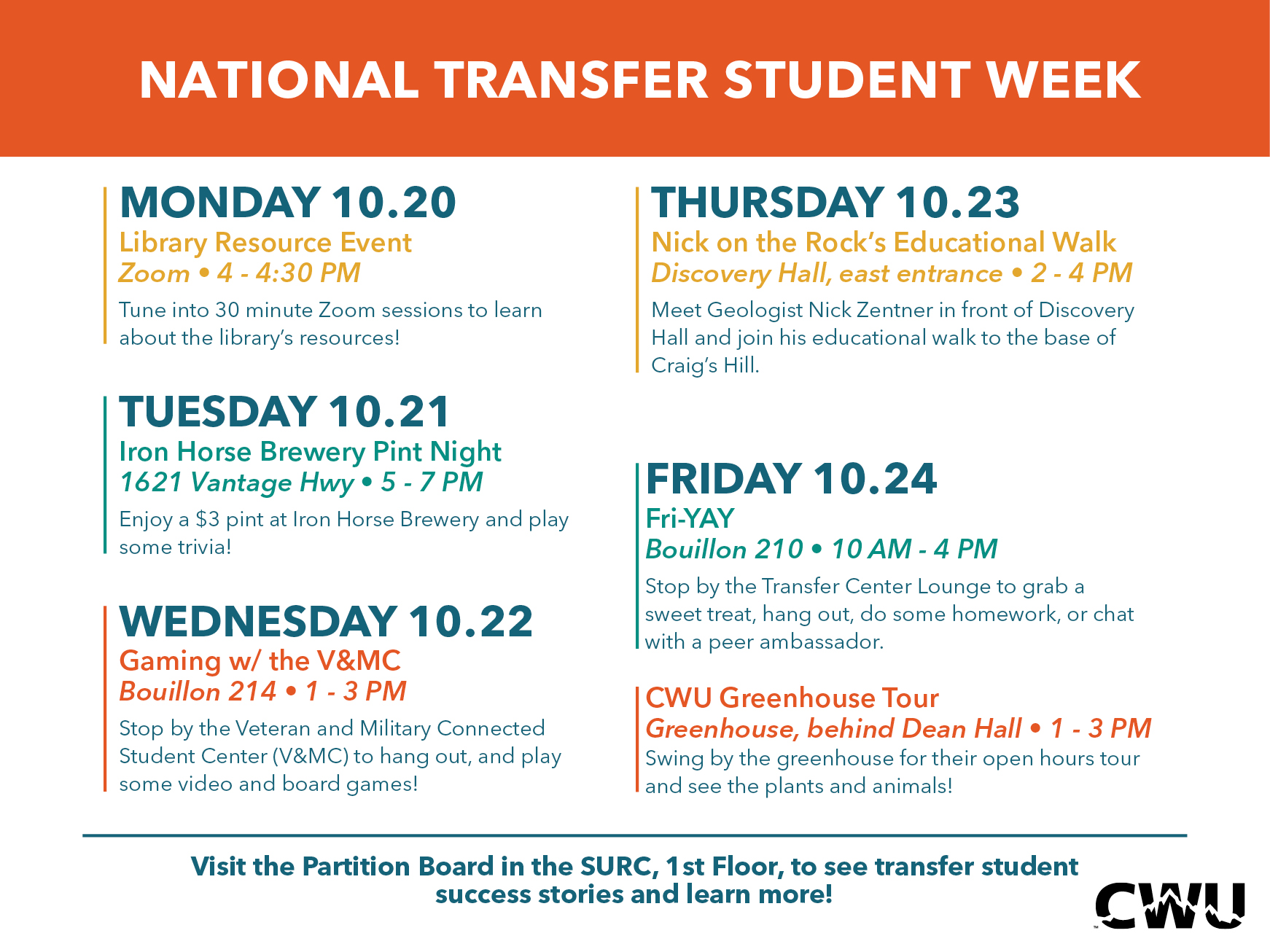 Did you know that transfer students comprise more than 40% of CWU students? If you transferred to any CWU location or are thinking about transferring, join us for our celebration of National Transfer Student Week! We know you will do something great - and it starts wherever you are today.