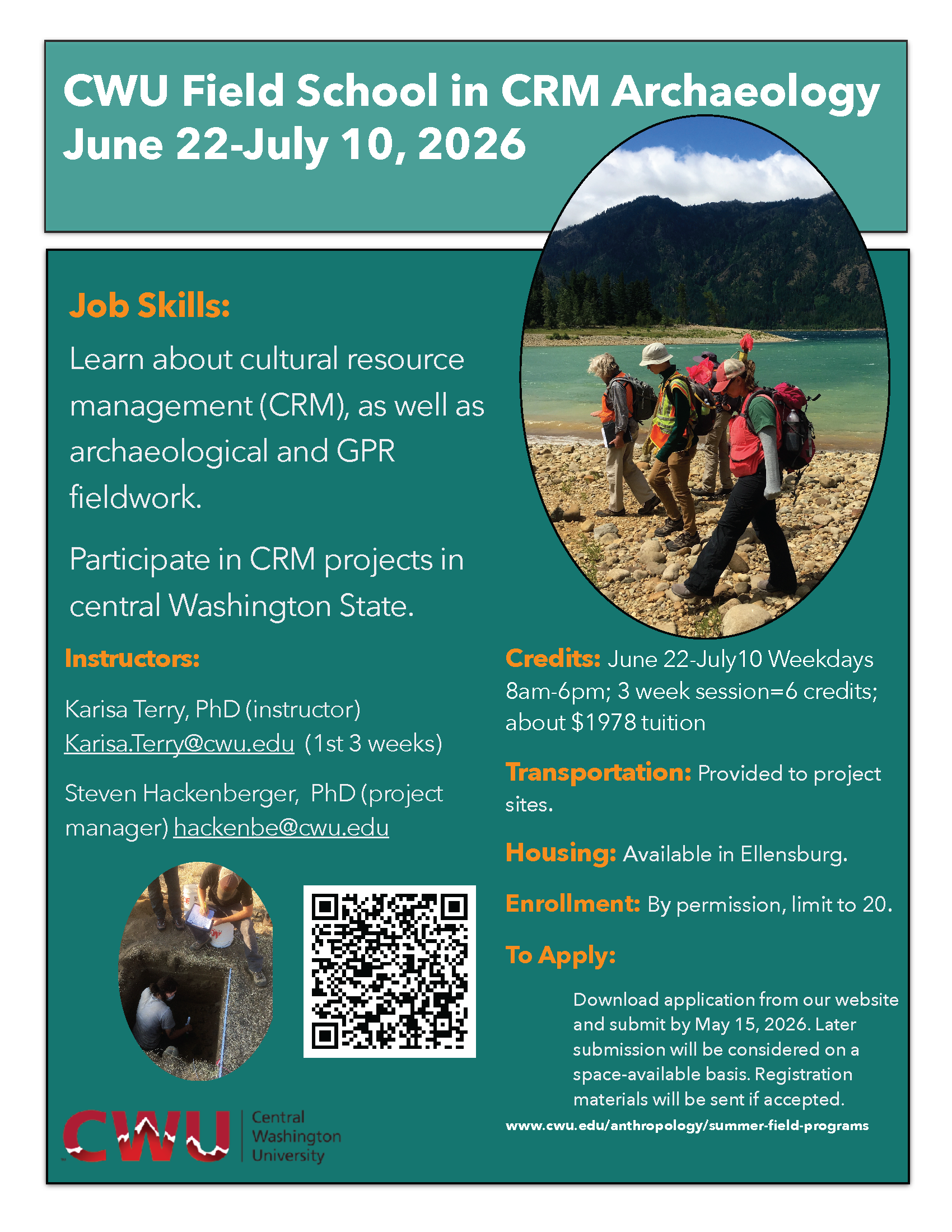 Learn about cultural resource management (CRM) and archaeological and GPR fieldwork. Participate in CRM projects in central Washington State. This in-person field program runs three weeks for 6 credits (quarter system). Meetings are in Ellensburg, and leaving from campus to the field on weekdays, typically 8 AM-5 PM daily. The 2026 dates are June 22-July 10. See the documents below for more details and an application to complete and email to the instructor Dr. Karisa Terry.- CWU CRM Archaeology field school flyer