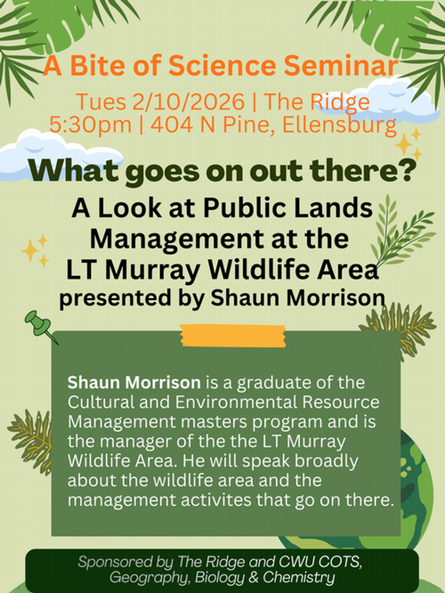 Please join us on Tuesday, February 10th, 5:30pm at The Ridge (404 Pine St. Ellensburg) for A Bite of Science Seminar, where Shaun Morrison, a graduate of the Cultural and Environmental Resource Management and will present, “What Goes On Out There? A Look At Public Lands Management at the LT Murray Wildlife Area.”