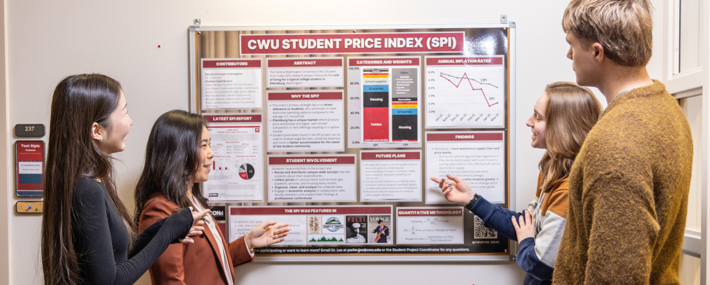 Each month, students collect prices for items in this basket from a wide range of sources, including grocery stores, gas stations, restaurants, housing platforms such as Zillow, local business websites, and on-campus partners such as the Wildcat Shop and Dining Services. These data are used to compute the monthly Student Price Index and student inflation rates, offering timely insights into price changes that directly affect student life in Ellensburg. The SPI Project is fundamentally student-centered and experiential. Students play a central role in survey design, data collection, analysis, and reporting, working closely with faculty in a collaborative, low-stakes research environment. Participants gain hands-on experience in economic analysis, data management, statistical software, and professional communication, while also developing presentation and networking skills. Students regularly share their findings with the Kittitas County Chamber of Commerce and present at venues such as CWU Symposium of University Research and Creative Expression (SOURCE), the Pacific Northwest Regional Economic Conference, and the Economics Department’s Economic Outlook Conference. Through sustained engagement, the project not only enhances economic literacy and career readiness but also provides a meaningful opportunity for students to contribute to applied research with real-world impact.