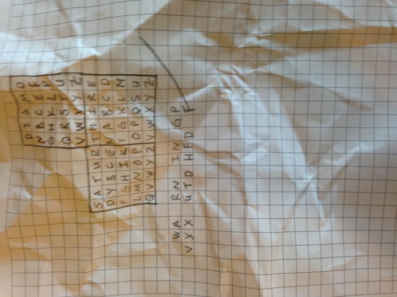 We can’t believe our luck! Our undercover agent walked in while the ring leader was encrypting a message using the new scheme. She managed to take a picture of a scrap of paper on the desk that must indicate how messages are encrypted, although she noticed quite a few other scraps of paper with similar squares of letters in various arrangements. Shortly afterwards we intercepted a message that was probably encrypted using this method. However, neither we, nor the agent, are quite sure how this scheme works. We hope you can help us figure it out and break the encrypted message. We are worried our agent has been discovered so she is going to lay low. Please send us the contents of the encrypted message as soon as possible!