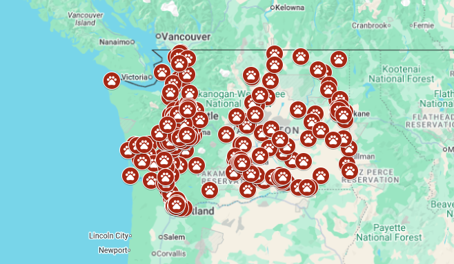 Image is a Washington State map with hundreds of red paw prints marking the locations of partner high schools.